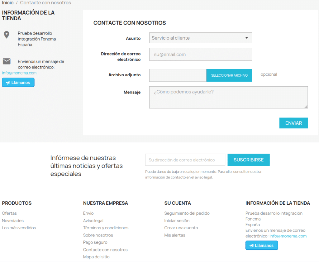 - Where to load the click2call in the store: indicates where the call button will appear in the PrestaShop store. If In store information is chosen, it will appear on the bottom skirt and in the contact information, and if Floating is chosen, it will always appear visible over the web.