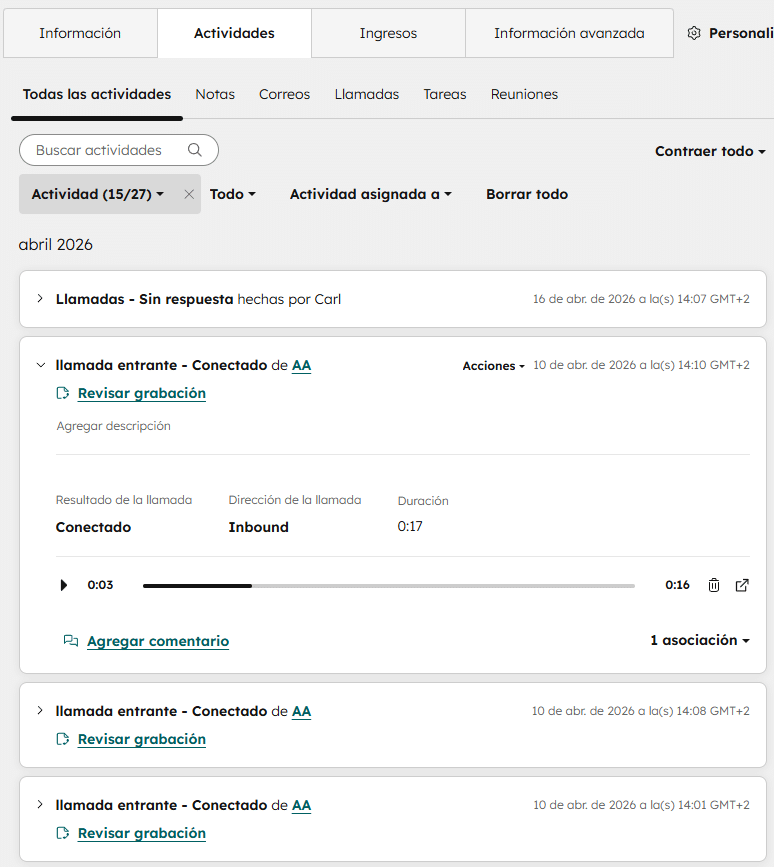 También podrá ver el registro de llamadas desde las actividades asociadas al contacto y desde la vista de llamadas.